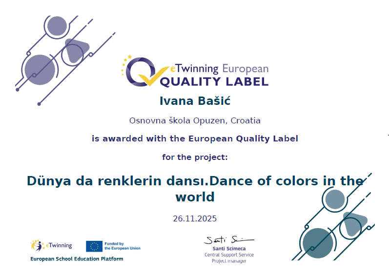 S ponosom objavljujemo da su učenici i njihova učiteljica Ivana Bašić osvojili “Europsku oznaku kvalitete“ za međunarodni projekt “Dünya da renklerin dansı – Dance of Colors in the World”. Ovo priznanje potvrđuje da je rad naših učenika prepoznat kao iznimno kvalitetan, kreativan i pedagoški vrijedan na europskoj razini.